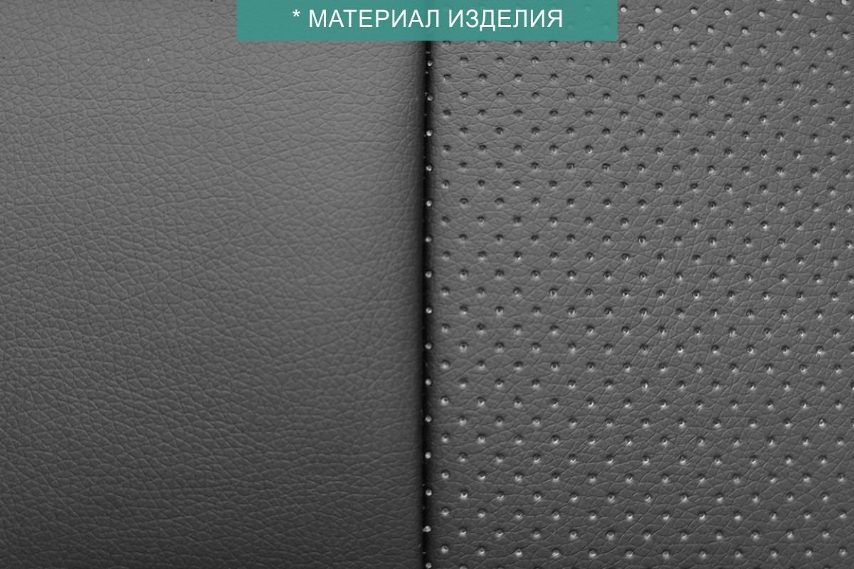 Авточехлы изготовлены из двух видов экокожи черного цвета: гладкой и перфорированной. Перфорированная экокожа используется в центральных элементах, что обеспечивает циркуляцию воздуха.