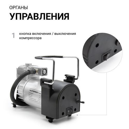 Компрессор воздушный AUTOPROFI, 60 л./мин., 12V/23A, 280W, шланг 3 м., шнур питания 3 м., питание от АКБ, клапан для регулир. давления, набор из 4-х переходников для надувн. изделий, сумка
