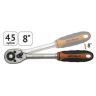 Флажковый механизм трещотки позволяет переключать направление рабочего вращения и обеспечивает минимальный угол поворота 8 градусов за счет привода с 45-тью зубцами.